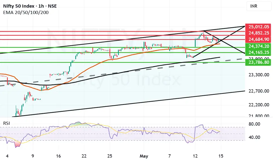 It was a volatile day on browsers where Mother line of hourly chart gave support to Nifty and helped it close in Green. after opening in Green Nifty and making a high of 24767 Nifty saw selling pressure which took it to as low as 24535 losing over 232 points. There Nifty found the support of Mother line and rose 141 points closing at 24666 which is 88 points hig from yesterdays close. Further volatility cant be ruled out as Nifty is facing the resistance of the trend line at 24684. If this level is crossed Nifty can find further resistance at 24852 and 25012. 25012 seems to be a Channel top resistance which will be little difficult to cross. Supports for Nifty remain at 24505 (Mother Line Support), 24374, 24165 and 23979 (Father Line Support). If Father line support is broken by chance bears can drag Nifty further down to 23786 levels. Around this zone we will also have mid channel support of the parallel channel. Thigs are delicately poised with positive shadow of the candle.