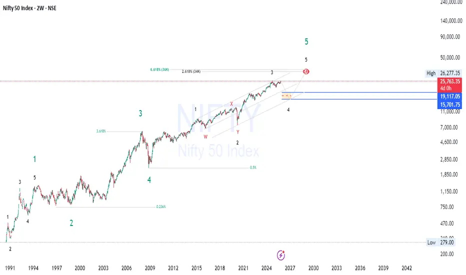 NIFTY’s long-term trend is still intact — but short-term, this is a golden short setup inside a major Wave 4 correction. The correction could last well into 2026 before the final euphoric push to 34K–36K by 2029.