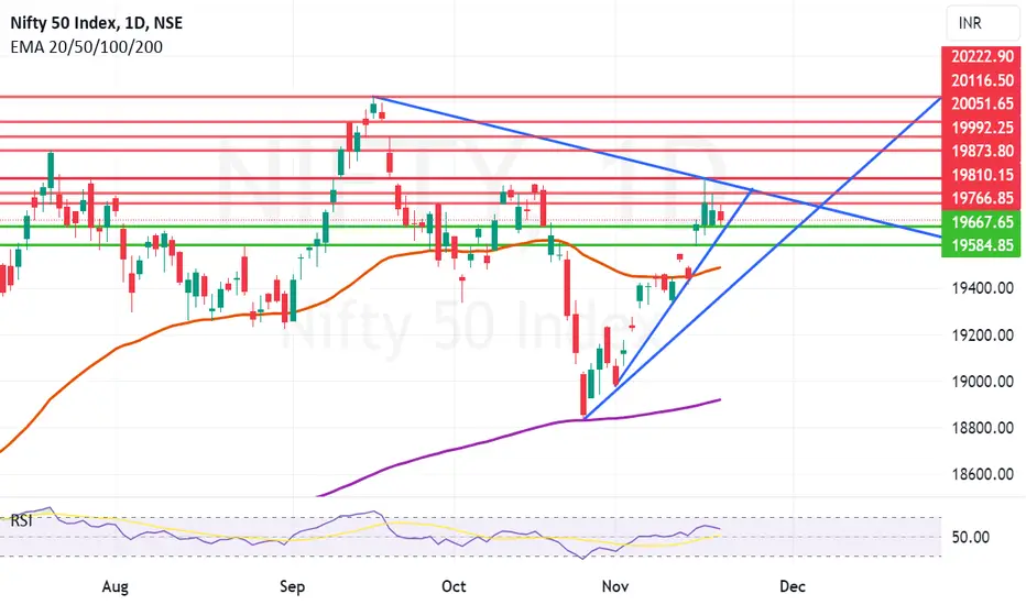 Nifty right now is in a zone where it has multiple supports taking any of which it can start climbing again. The major support zone from the current level is 19667 to 19584. Below 19584 the major support for Nifty will be 50 days EMA (Mother Line) near 19487. Resistances on the upper side for spot nifty are near 19766, 19810, 19873 and 19992. Above 19992 Nifty can rise to 20051, 20116 and finally previous peak of 20222. So it might be a range bound few days till election results are announced.