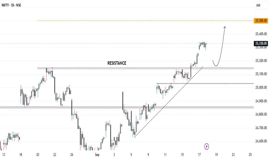NIFTY has successfully broken the resistance level of 25,150 and is holding steady above it. A retest of this level could provide a good entry opportunity, with the next target at 25,550.