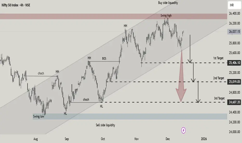NIFTY 50 on the 4H timeframe has reached a key buy side liquidity zone near the upper boundary of an ascending channel. After forming a swing high price shows signs of distribution and potential reversal. A downside move is anticipated toward sell-side liquidity with projected targets at 25,406, 25,019, and 24,607. Bias remains bearish below the recent highs.