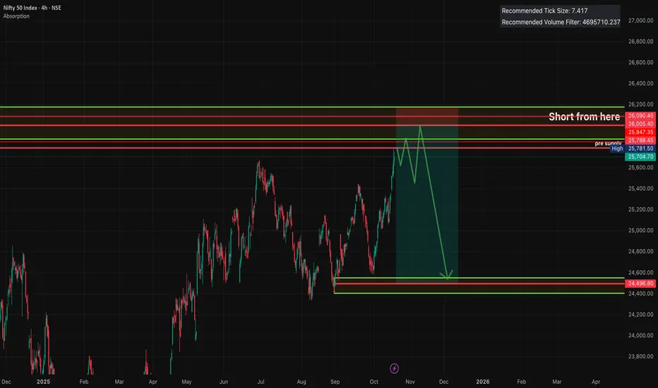 Short Nifty From 26000 for huge sharp sell off. Creating double top pattern with lifetime high, with sharp rally upwards expecting huge orders to sell from 26000 levels. SL is at 1.5% higher to Lifetime high or check the trade plotted on the chart for Entry. SL and target.