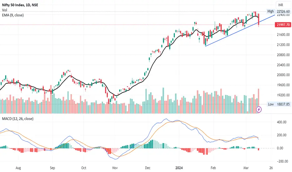 Nifty has broken the trend line support and formed a red big candle with upper and lower shadow.