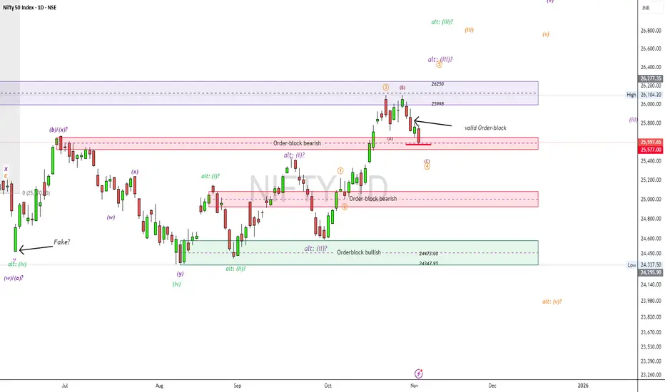 If N50 declines deeper, the targets would be at or around the 25091–24938 levels. In normal times, waves iv does not correct steeper as a 0.5 retracement. On the other hand is the chance given, that we are not moving in a wave iv, moreover we would be in a wave ii?