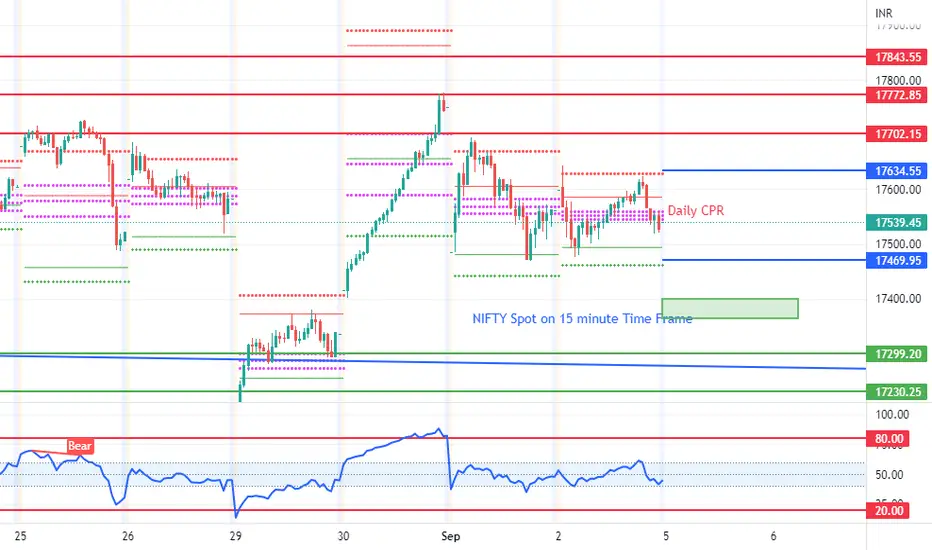 Now in 15-minute time frame- we have marked these two levels in colour blue at 17634 and 17469, if Nifty opens in between this zone, we will enter when Nifty crosses either side. For down trend, a range between 17398 to 17363, 17299 and 17230 will act as important support levels. Similarly for upside move, 17702, 17772 and 17843 will act as major resistance levels. In between 17634 and 17469 we may avoid a directional trading, but if Nifty took support or resistance at either side, we may plan to go for a short strangle, opening one leg at a time.