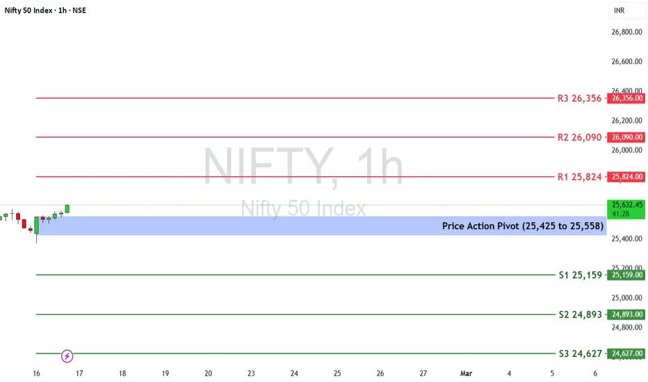 If Nifty reclaims and holds above the pivot zone (25,425–25,558), upward momentum may push the index toward R1 (25,824).