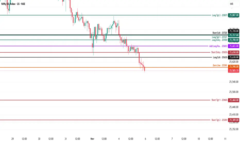 Nifty is under pressure, trading at 25,585 after a consistent intraday slide, breaking down below the zero line at 25,598. Momentum remains weak as price continues to create lower lows, putting the short side in clear focus for today's session.