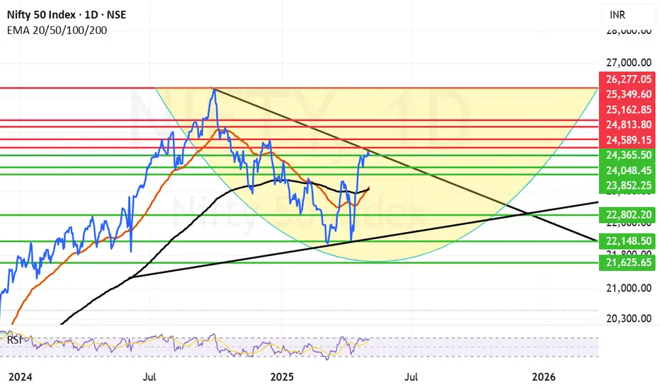 Nifty once again tried to sustain the levels above 24500 but again faced resistance and pulled back. Amidst the drums of Ind-Pak war beating and ongoing tariff war the investors are afraid to take seriously long positions. Also we will have a US Fed rate decision coming up which is also adding to the investor anxiety. Mid and Small cap took the maximum brunt today due to all these factors. The Nifty resistance at 24589 is proving very difficult to be conquered with all the noise going around. Nifty resistance levels remain at 24509 and 24589 if we get a closing above 24589 Nifty can easily move for war 24813, and 25162. Supports for Nifty on the down side are at 24365, 24048, 23852 and the zone between 23515 (Mother line) and 23461 (Father line). If we get a closing below 23461, Nifty can again fall to the levels of 22802, 22148 or even 21625. (That is in adverse geo-political developments). A lot right now depends on Macro factors affecting the index and overall situation on Geo-Political front.