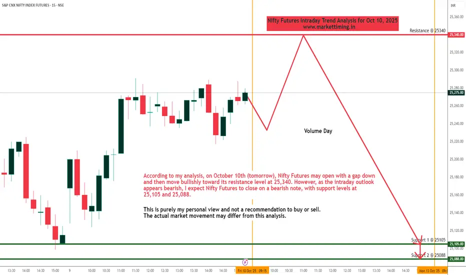 According to my analysis, on October 10th (tomorrow), Nifty Futures may open with a gap down and then move bullishly toward its resistance level at 25,340. However, as the intraday outlook appears bearish, I expect Nifty Futures to close on a bearish note, with support levels at 25,105 and 25,088.
