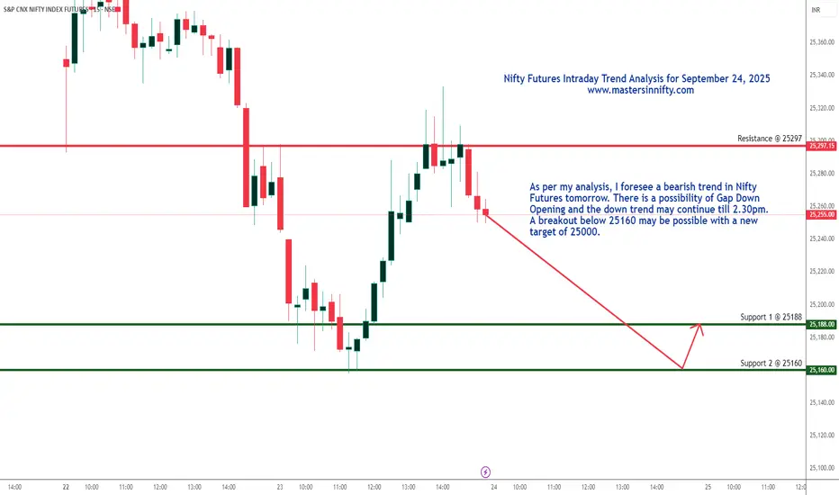 According to my analysis, a bearish trend is on the cards with Support levels at 25188 and 25160. Once it breaks 25160, there is a possibility of the next support levels at 25130 or 25000.