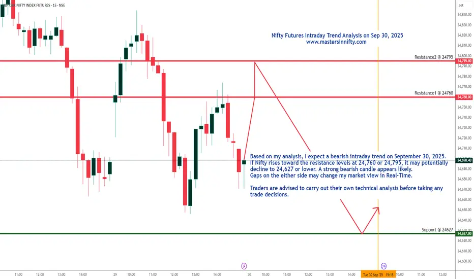 Based on my analysis, I expect a bearish intraday trend on September 30, 2025. If Nifty rises toward the resistance levels at 24,760 or 24,795, it may potentially decline to 24,627 or lower. A strong bearish candle appears likely. Gaps on the either side may change my market view.