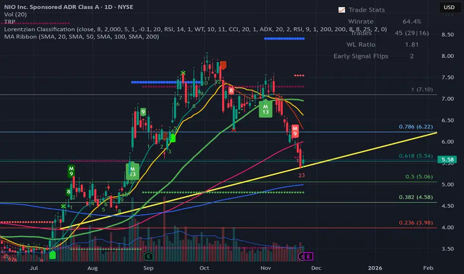 NIO has been selling off through November and is now sitting right on top of a major support cluster ahead of its earnings. Price is currently around 5.50, trying to hold near the 0.618 Fib level.