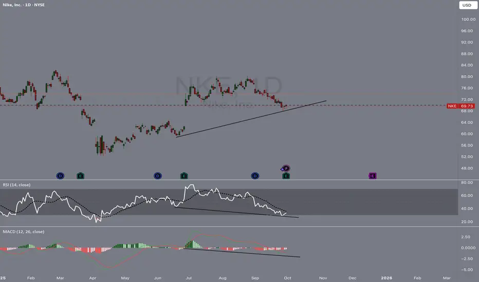 - NKE has been in a downtrend, recently pulling back to trendline support around $69–$70.