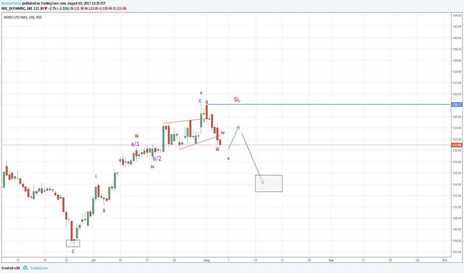 It looks like NMDC has just completed a 5 legged up move with the Wave 5 being an Ending Diagonal.