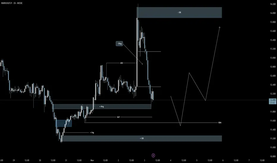 Currently, NMR is reacting within a bullish Fair Value Gap (+iFVG) zone, but liquidity beneath the recent low remains uncollected. This indicates the probability of another liquidity sweep toward the lower OB (~11.0-11.2 zone), where multiple confluences align