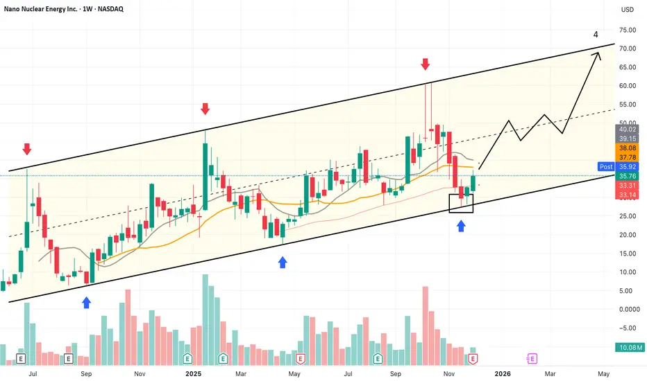 The smallest stock in the micro nuclear reactor sector shows the most consistent movement in the group, continuing to swing from the lower edge of the channel to the upper.