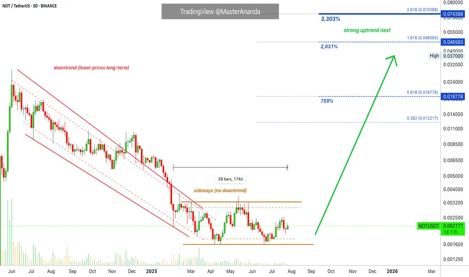 Notcoin (NOTUSDT) is trading just above the 2025, 3-February low. This low and major bearish breakdown signals the start of the formation of a bottom. An accumulation sideways phase at bottom prices. This phase has been going for 174 days, almost 6 months. That is six months with Notcoin accumulating, slowly, at bottom prices. What do you think is going to happen when Notcoin breaks out? It will be huge. It has been doing nothing for 6 full months and this is the type of pattern that fuels major growth.