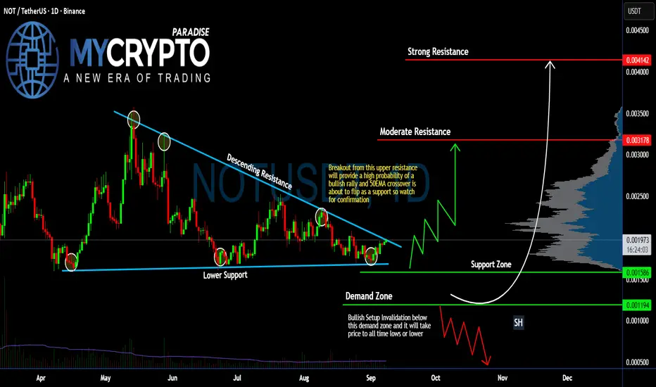 💎After months of consolidation, #NOT has been trading inside a descending triangle, with clear descending resistance pressing price down and lower support holding the structure since April. Right now, the price is sitting at $0.00197, testing the upper boundary of this pattern.
