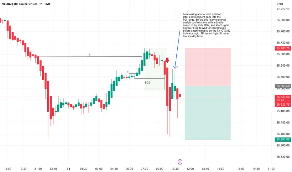 I am looking at at a short position after a retracement back into the POI range. Before this I saw technical analysis confirmations with a double sweep of liquidity, BOX, and short signal however I like to wait for confirmation before entering based on the TX ICT/SMC Indicator logic. TP, recent high, SL recent low liquidity level.