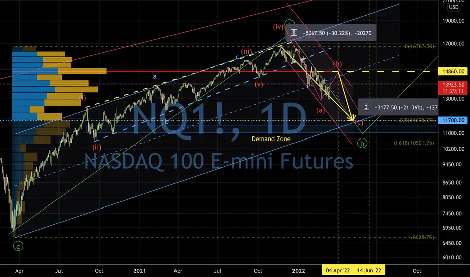 NASDAQ bearish corrections probably not completed yet. As Nasdaq price may just completed its wave (a) (Red) of wave (a)(b)(c) (Red) of bearish correction which might toke around -30.22% “drawdown” ( from 16767.50 ⬇️ 11700 ) a fibo 0.50 and lower support line of up channel + demand zone. Possible another -21.36 “correction “ from 14860 ( Volume Profile POC + upper down channel resistance) toward 11700. So.. possible need to wait “patiently” for picking up technology stocks...