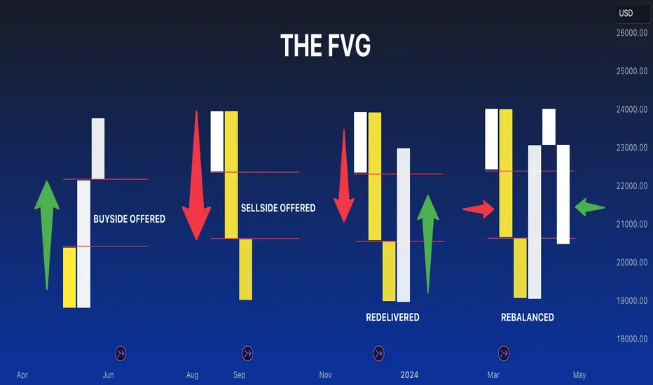 IPDA not only engineers liquidity in the markets by moving price, by design it has to offer fair value for buying and for selling. This too is based on its market efficiency paradigm logic. In some cases, IPDA may reprice too quickly in one direction over another, thus leaving an inefficiency in price delivery (A FVG). In order for IPDA to maintain its fair value parameters, it will reprice to rebalance the inefficient price action to offer fair value to both sides of the market. The example above is known as a BISI. This is where IPDA has repriced to buyside too quickly. This leaves a buyside imbalance (the space between the red lines). The wicks offer both buying and selling in the up and down movement. The body where no wicks overlap is all buyside delivery and inefficient of any sellside
