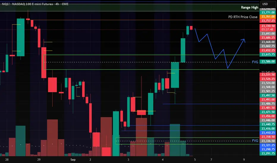 NQ seeming quite bullish starting in September. On this 4hr chart we can see price completely disregard the FVG create last Friday. I can see price staying above the 23,584.00 range and possibly filling the entirety of the inversion area before heading back to the upside. Volume footprint shows that there were very few buyers in last Fridays dump.