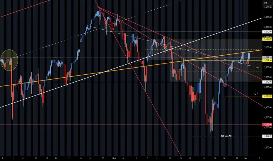 Not sure it happens today, the drop or retest of lower KL 24,625 is on the way. Since 11/21 the NQ volume has dropped and the lift has run up. Looking for max lift near 25,766 and then the Turn for the drop test. AI Bubble, Tariff refund, Geo, etc. chitter chatter seems to be getting louder. Up in O/N and down is Reg is the pattern to anticipate. Watch the O/N into Reg Session Pump/Dumps. Note