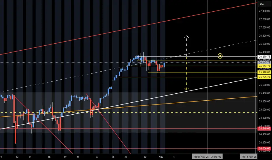 The F-M Long move is on with new month and O/N Gap Open UP. Curveball form Friday Close and late head fake. Again, the NAZ will have to use the O/N to lift it back up. Need to see how the Open Drive and Reg Session reacts to the low volume O/N lift. Run up to upper target above KL 26,290 and Short on reject of. Under 290 is a potential drop to 25k or 25,550.