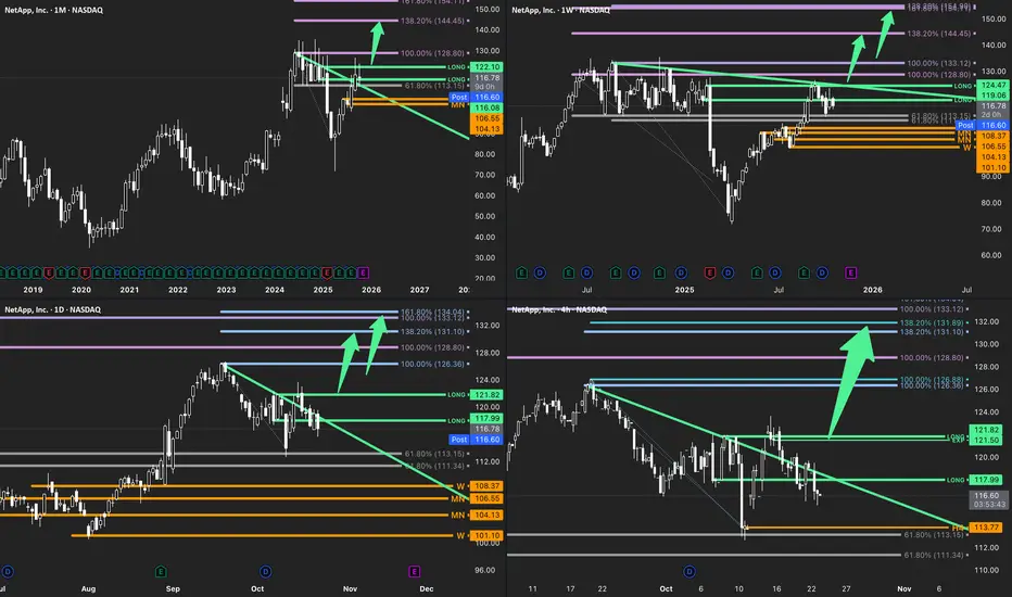 NetApp’s structure aligns across all timeframes, confirming a transition from correction to expansion. Sustained closes above 121.50 validate the bullish path toward 133.00–138.00. A close below 113.77 would neutralize the current bias.