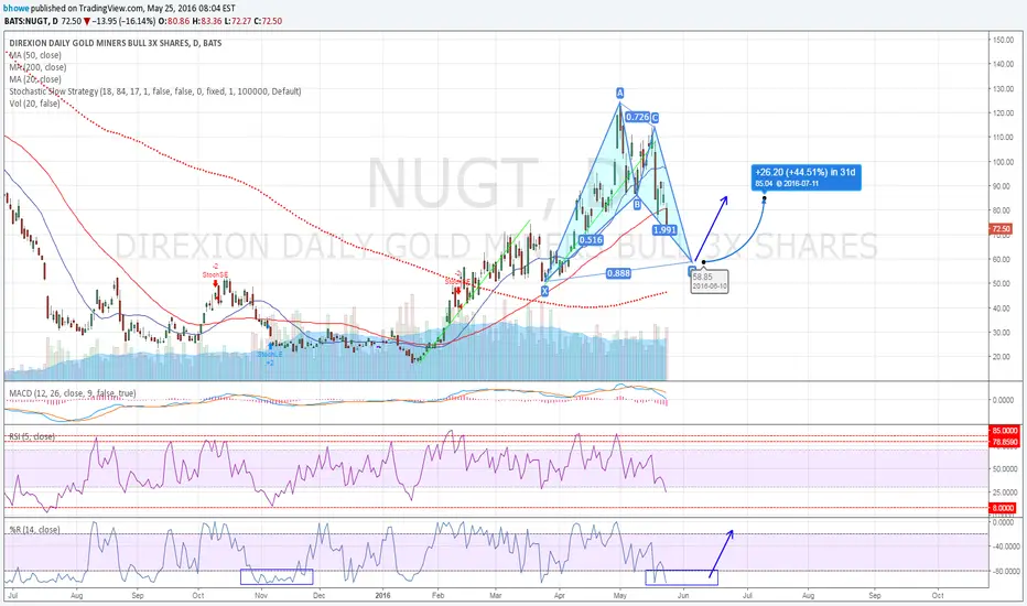 With Gold correcting I can see a Bullish Bat pattern playing out. If the pattern fills, we can expect a low of $59 and then a 50% retracement higher to the $85 area or 44% gain. Wait for it to breach $59, then buy. Take the DUST trade now, IF you feel comfortable with the 3x.