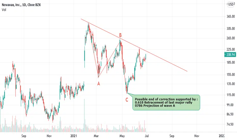 NVAX has reacted well to very strong support formed by 0.618 Retracement of last major rally and 0.786 projection of possible wave A of an ABC form of correction. This is shown on the chart.