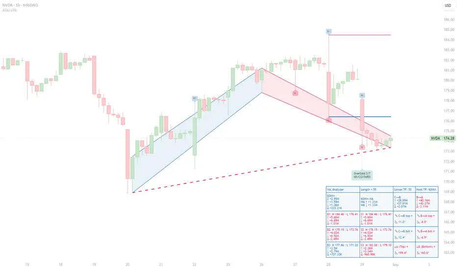 Context – This 60‑minute NVDA chart uses the ATAI Volume Pressure Analyzer (VPA) on a 55‑bar window. The indicator plots an A→B→C structure: the blue C→B segment tracks the preceding advance and the red B→A segment the subsequent pull‑back. Up‑volume and down‑volume are calculated on a lower time frame and then aggregated into host‑time‑frame bars to expose buying and selling pressure.