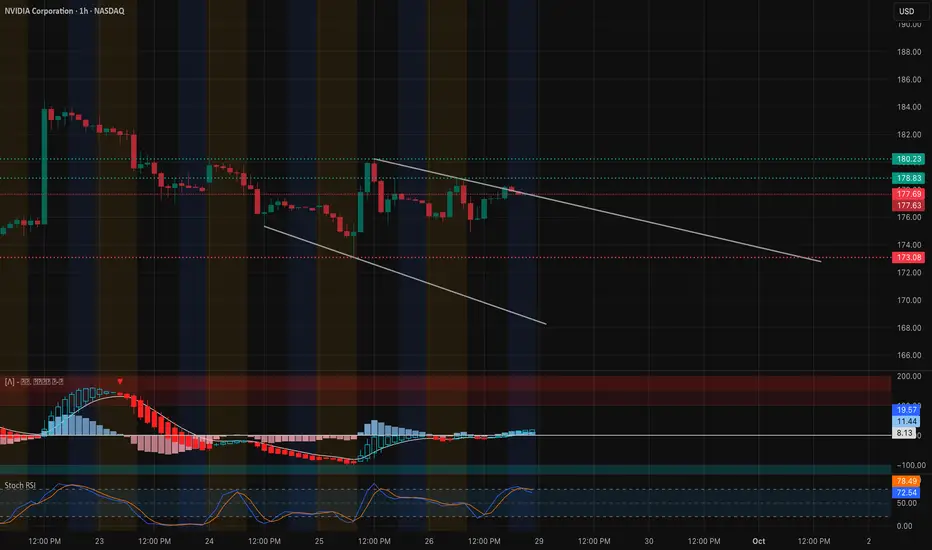 1-Hour Technical Outlook NVIDIA has been grinding inside a narrowing descending channel after its recent selloff, with intraday price now stabilizing around $177–$178. A series of higher lows over the last two sessions hint at basing, but the short-term downtrend line from the $185 zone still caps upside. MACD histogram just turned positive and the Stoch RSI is pointing higher, signaling an early shift in momentum. Immediate resistance sits at $180.2, followed by the heavy supply zone between $182.5 and $185. Key support levels are $175 (short-term pivot) and $172–$170 (structural demand).