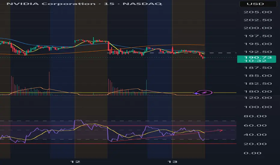 Price accelerated through solid red divergence line on RSI. If yellow RSI moving average drops below 40 on RSI expect further acceleration to 188 and potentially lower.
