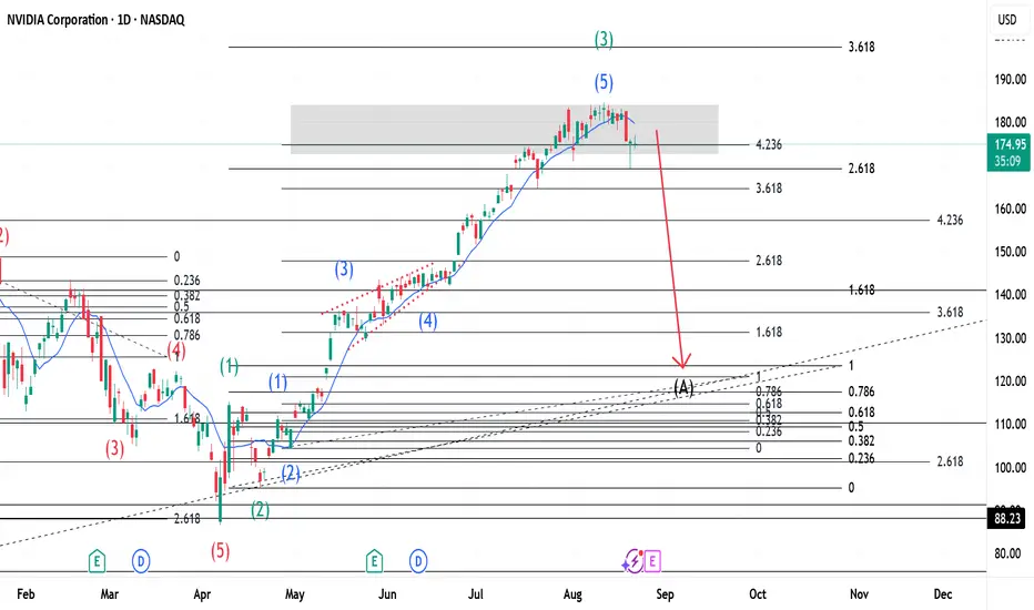 This is an update of a previous publication(link below). With price above the 423% Fib. level, this means that there is overbuying. Using Elliott Wave Theory we can see that Wave 3(Green) is complete with 5 waves(shown in Blue) inside it. What should follow from this is a Flat correction for Wave 4(Green) because Wave 2(Green) was a Zigzag. The Red arrow shows price direction only and points to a Wave A(Black) as our first wave for the Zigzag. This arrow does not show precise price ending rather shows direction. For more on the same, go to: