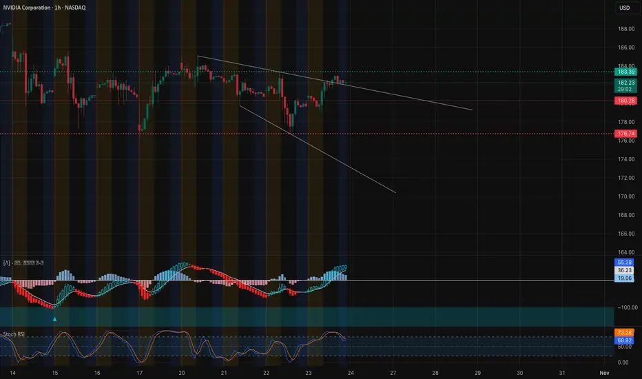 However, NVDA is still trading under a descending trendline from the mid-$180s highs. The latest 1H candle closed right below that resistance — meaning we’re at an inflection point heading into Friday. If bulls break above $183.50–$185, it confirms a structural shift toward higher highs. Failure here could keep NVDA locked in a range-bound corrective channel between $176–$183.