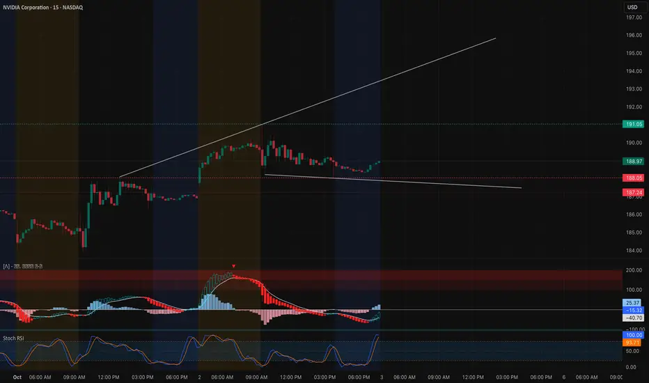 NVIDIA (NVDA) closed near $188.97, stabilizing after an intraday fade from the $191 zone. On the 15-minute chart, price action shows consolidation with buyers trying to defend key support: