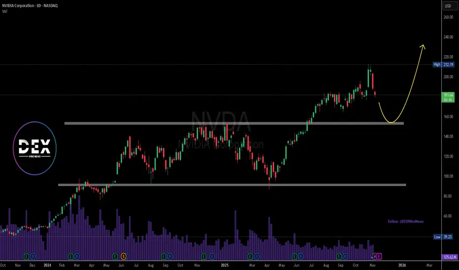 The NVDA chart shows a recent rejection from the $212 level, with price sliding toward $180. A further decline toward $160 support is possible before a rebound, as indicated by the yellow curve. Long-term structure remains bullish, but near-term weakness persists under regulatory pressure