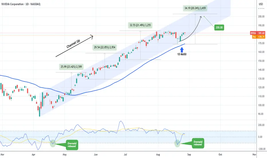 The answer can be given by purely looking at the technicals. Based on the bigger picture, the stock's 5-month pattern remains a Channel Up since the April 07 bottom, and in fact the recent dip on August 20 was a Higher Low exactly on the pattern's bottom and almost on the 1D MA50 (blue trend-line), which has been intact since May 06.