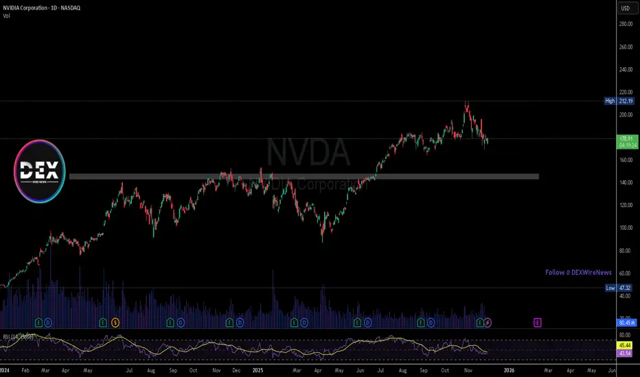 Nvidia’s overall trend remains bullish despite a slight pullback. Price currently trades around $178, holding above a key support zone at $145, which becomes the level to watch if broader tech stocks weaken. Upside momentum resumes if price pushes toward the $212 resistance area—its previous major high. A confirmed breakout above $212 would signal continuation of the broader bullish structure.