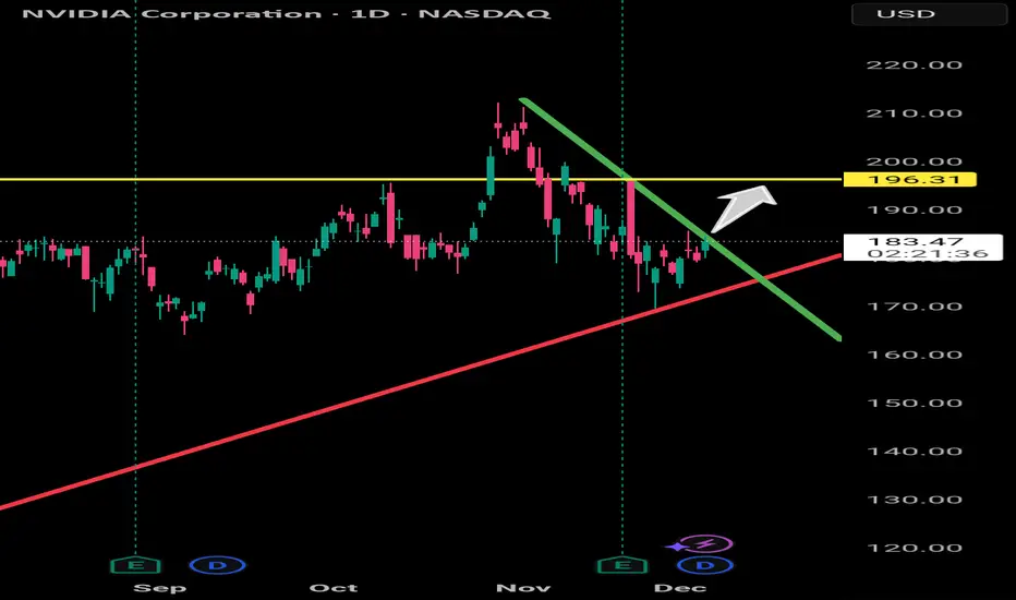 If price breaks and closes above the green trendline, momentum can shift bullish again, and the next logical magnet is the yellow horizontal level at 196.31.