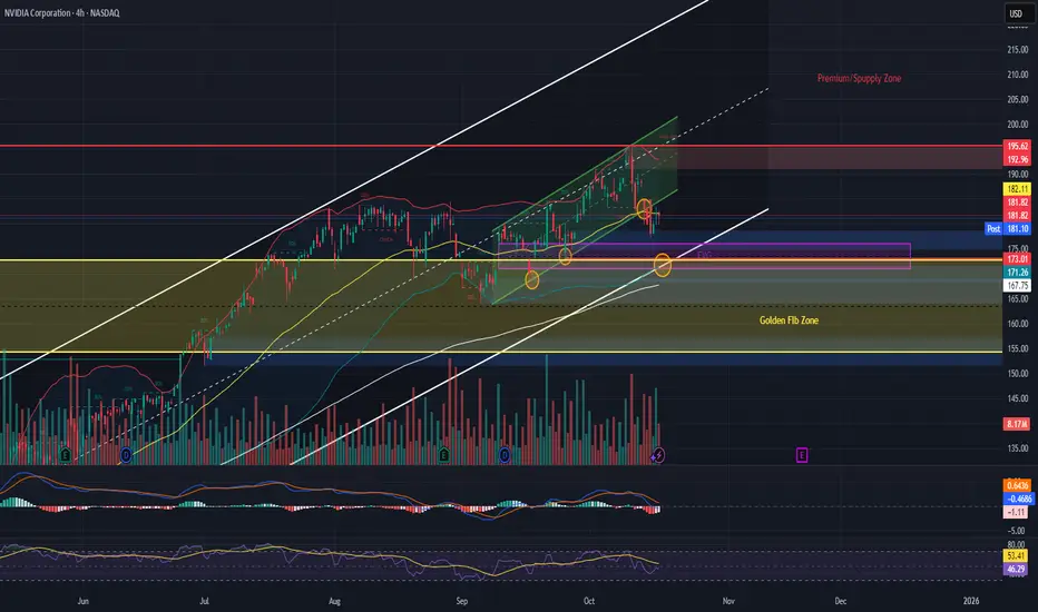 NVIDIA is currently testing the integrity of a larger ascending channel after breaking out of a smaller uptrend structure. The setup reflects a potential pullback to the Fair-Value Gap (FVG) zone around $171–$175, where confluence from multiple structural levels may support a continuation of the long-term uptrend.