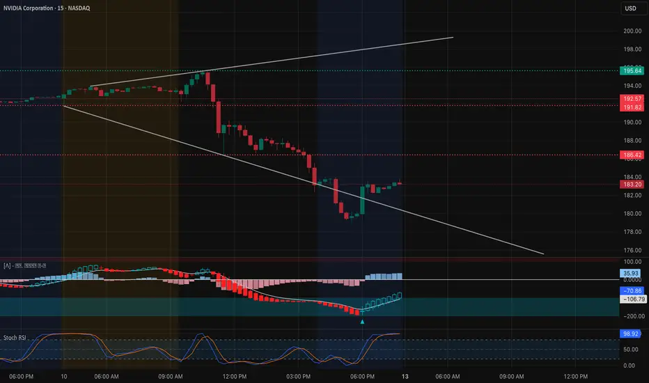 Friday’s session was brutal. NVDA fell sharply from around 192.5 and closed near 183, creating a steep descending channel that’s still active.