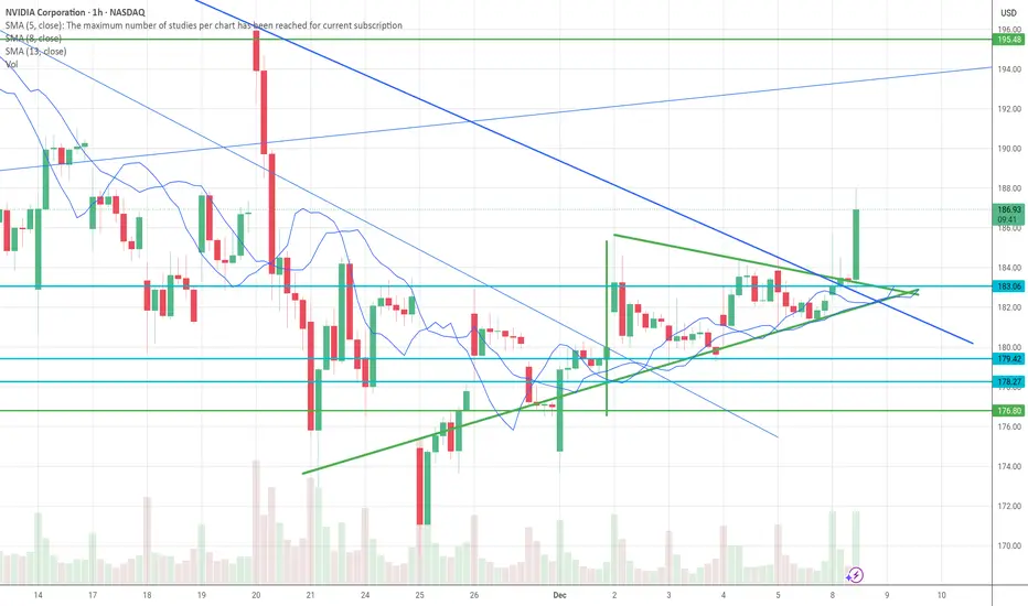 Key intraday / short‑term levelsSupport to hold the breakout:183–185: 20‑EMA zone and today’s intraday low area; losing this quickly would make today look like a fake‑out 178–180: prior micro‑swing area; below here, wedge breakout thesis weakens and risk shifts back toward 170s.Resistance / upside magnets:190–192: recent local resistance band flagged by several TA services and discretionary analysts as a sell zone on first touch.
