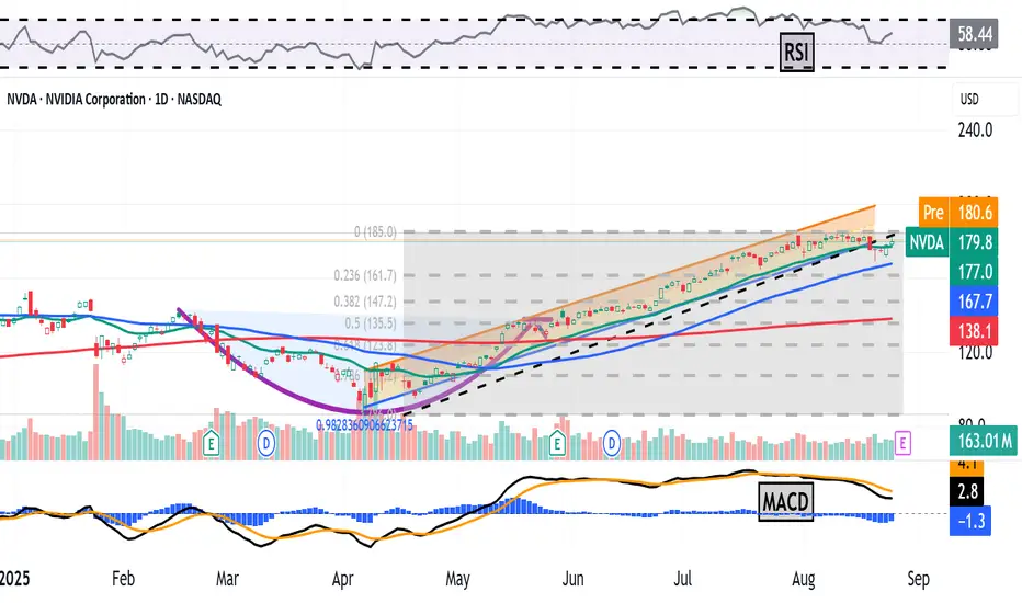 Readers will first note that a "cup-with-handle" pattern (the purple curving line at the chart's center) kicked off Nvidia's April-into-August rally.
