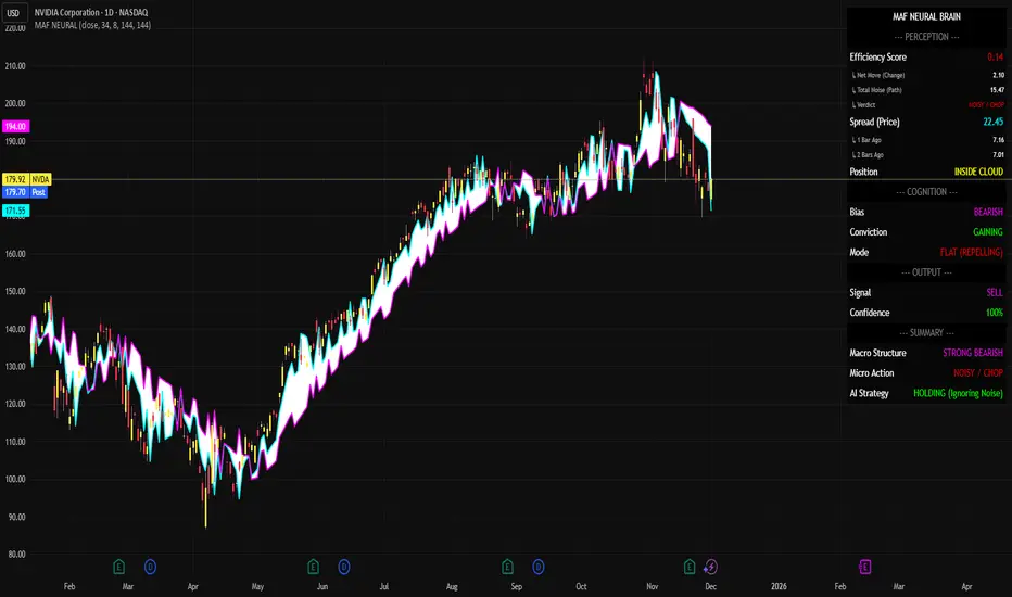 You are looking at the Daily chart for NVDA (NVIDIA Corporation). The broader trend is clearly bearish, and the MAF Neural Brain indicator has identified a high-probability continuation setup.