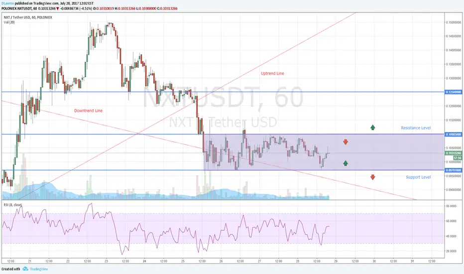 NXT like other coins moves in a range. We can draw a horizontal channel between a resistance and a support levels. Short terms trades can be opened when price bounces from the bottom border of the price channel. Stop orders for such trades must be placed below the support level. Profit target should be the top border. If price breaks the resistance level, we'll have a new buy signal with profit target at 0.125000 resistance level.