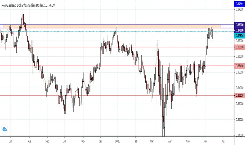 The daily chart shows a narrow band between 0.8780 and 0.8800 has held price for several months. Price action over the past 6 trading days clearly shows the inability of bulls to break above this zone.