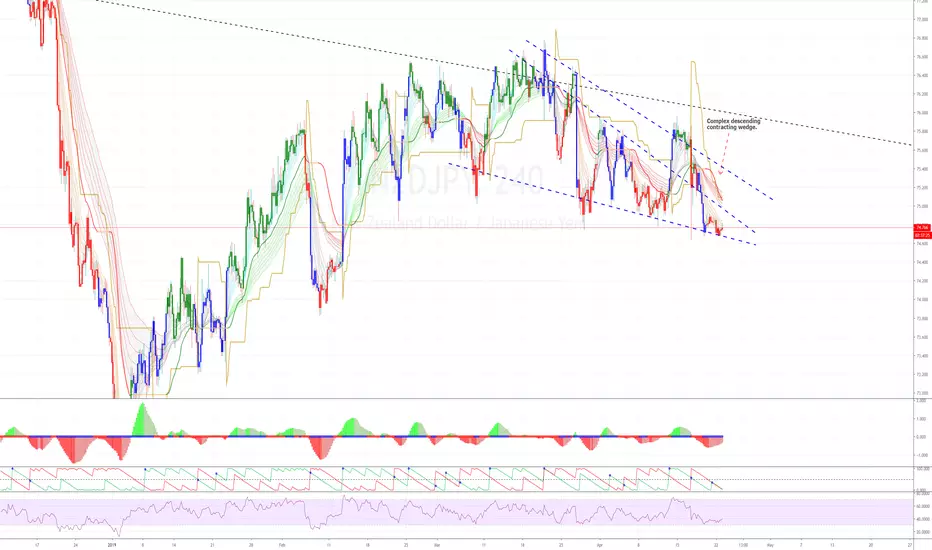 The wedge formation shown is not pure. It is complex. The tighter sharper wedge could see price falling out and to the south. The other enclosing wedge could see price rising north. In situations like these one has to decide: