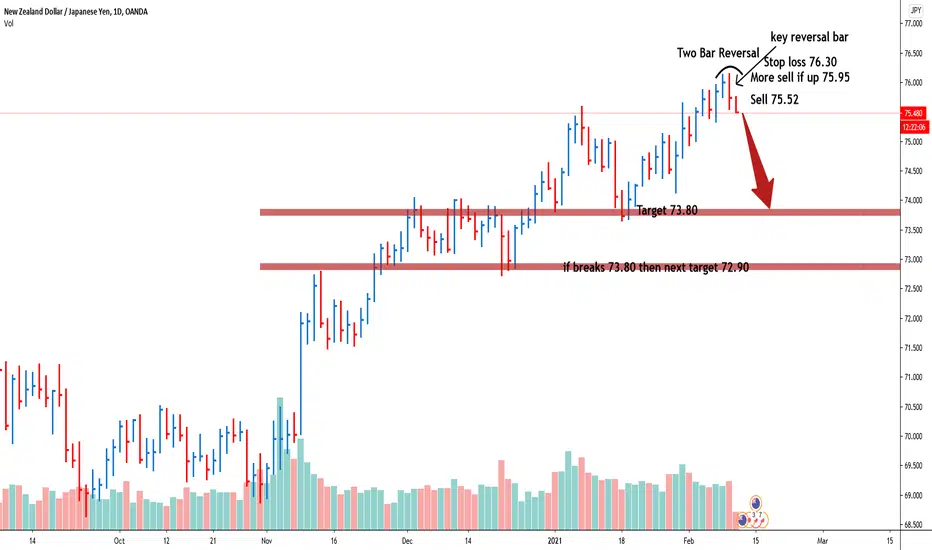 NZDJPY Two Bar Reversal & Key Reversal Bearish setup for 73.80